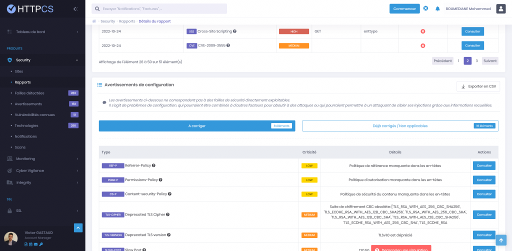 Ex. de détails techniques issus des rapports de scans de vulnérabilités de la plateforme HTTPCS